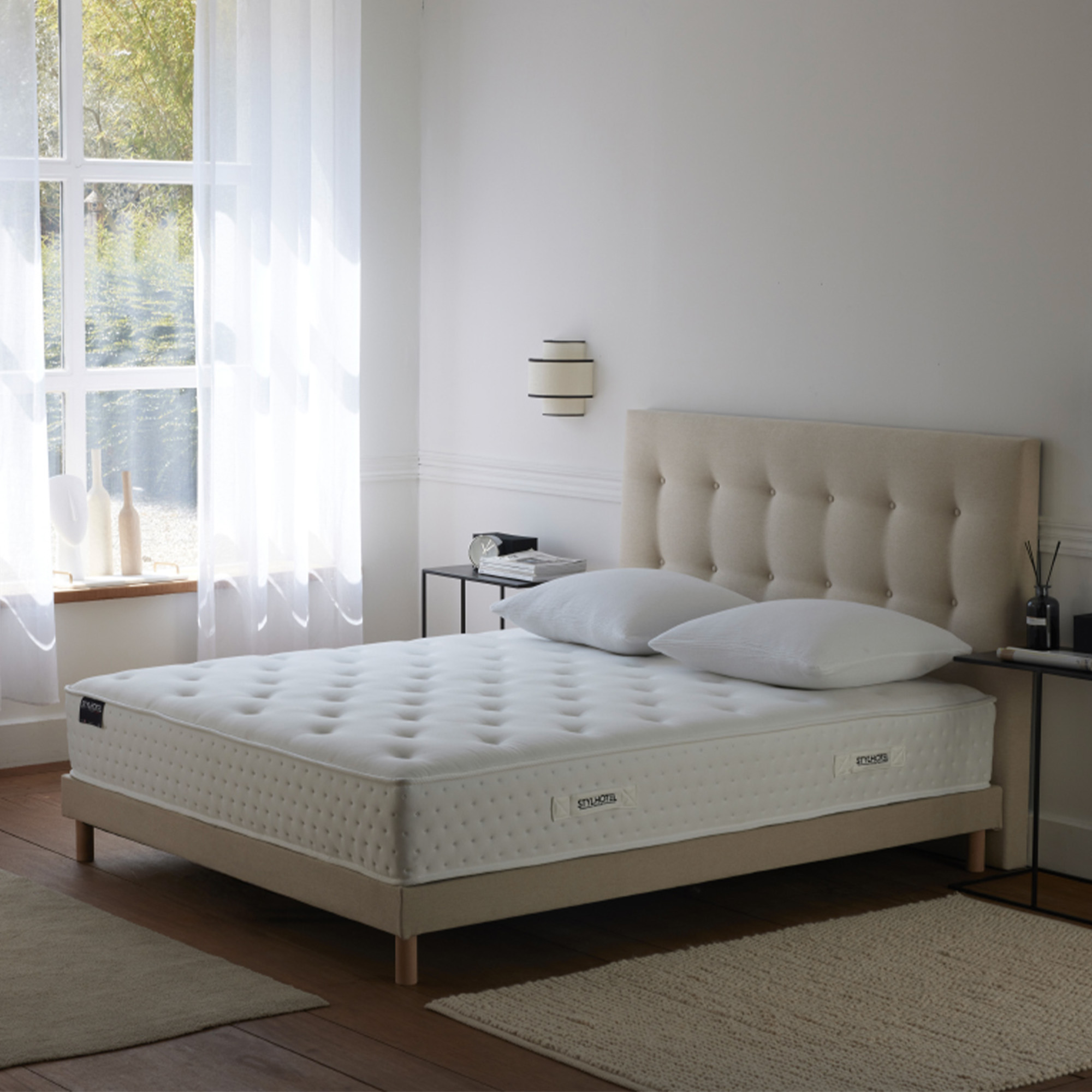 Un ensemble literie haut de gamme associant matelas hybride à ressorts TUDOR®, sommier à lattes fixes en bois massif et tête de lit capitonnée beige pour une chambre élégante, stable et confortable.