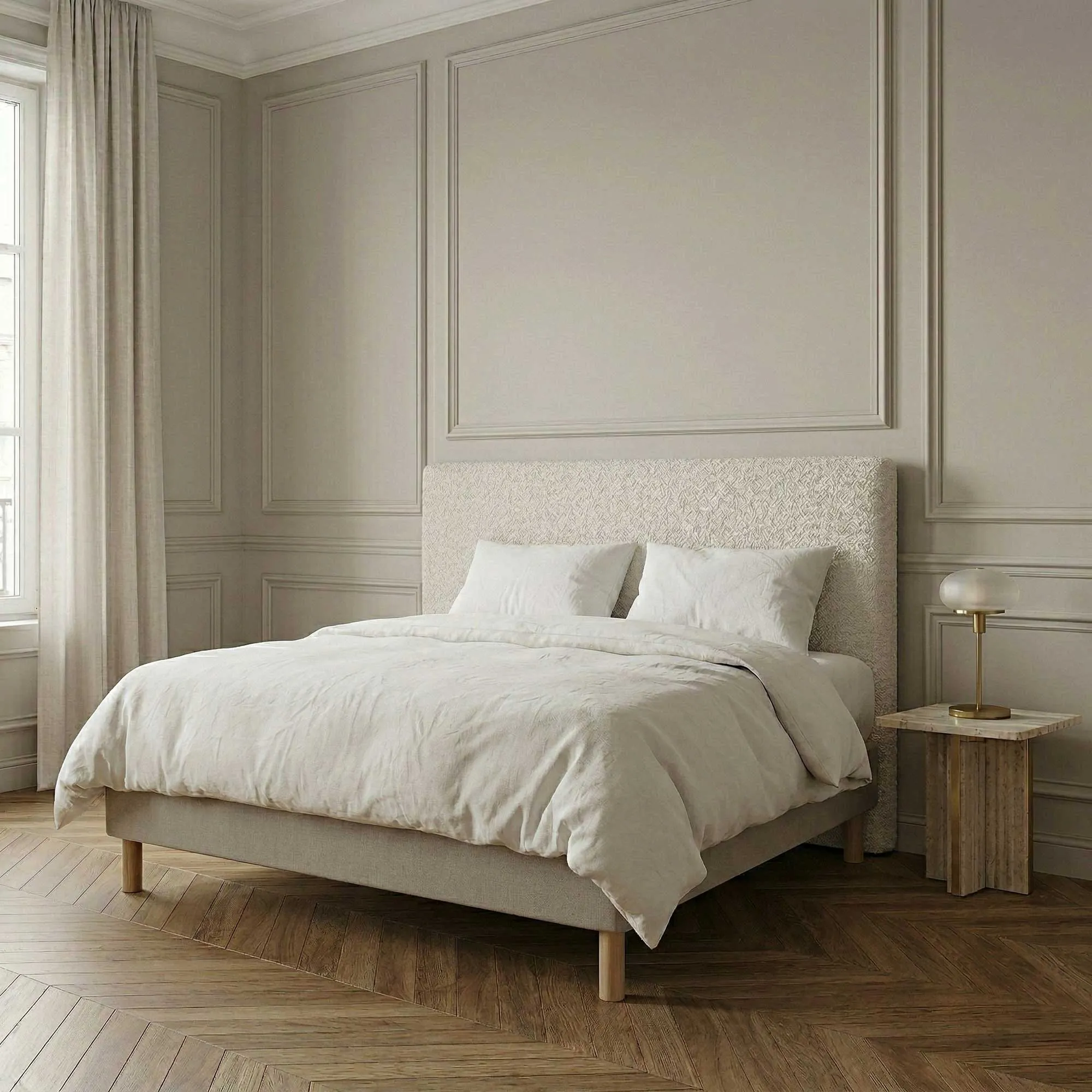 Le tissu bouclette apporte une atmosphère chaleureuse à votre intérieur grâce à son aspect doux, confortable et enveloppant. La structure de cette tête de lit est réalisée en bois massif. Elle intègre un rembourrage en ouate pour assurer un soutien et un confort optimaux. Ce modèle peut être associé à l'un de nos sommiers pour créer un ensemble harmonieux utilisant le même revêtement. L'installation ne nécessite pas de système de fixation car la tête de lit se pose directement au sol entre votre mur et votre sommier.