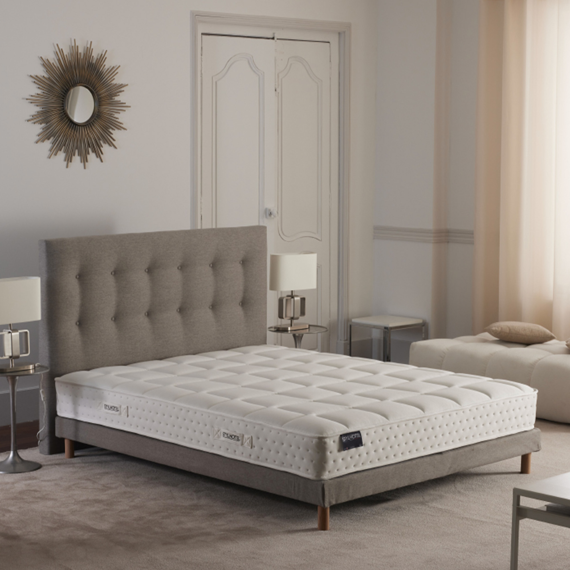 Fabriquée dans nos ateliers des Hauts-de-France, cette tête de lit capitonnée incarne le savoir-faire textile français. Elle est garantie 5 ans et peut être associée à nos sommiers dans le même revêtement pour un ensemble harmonieux.
